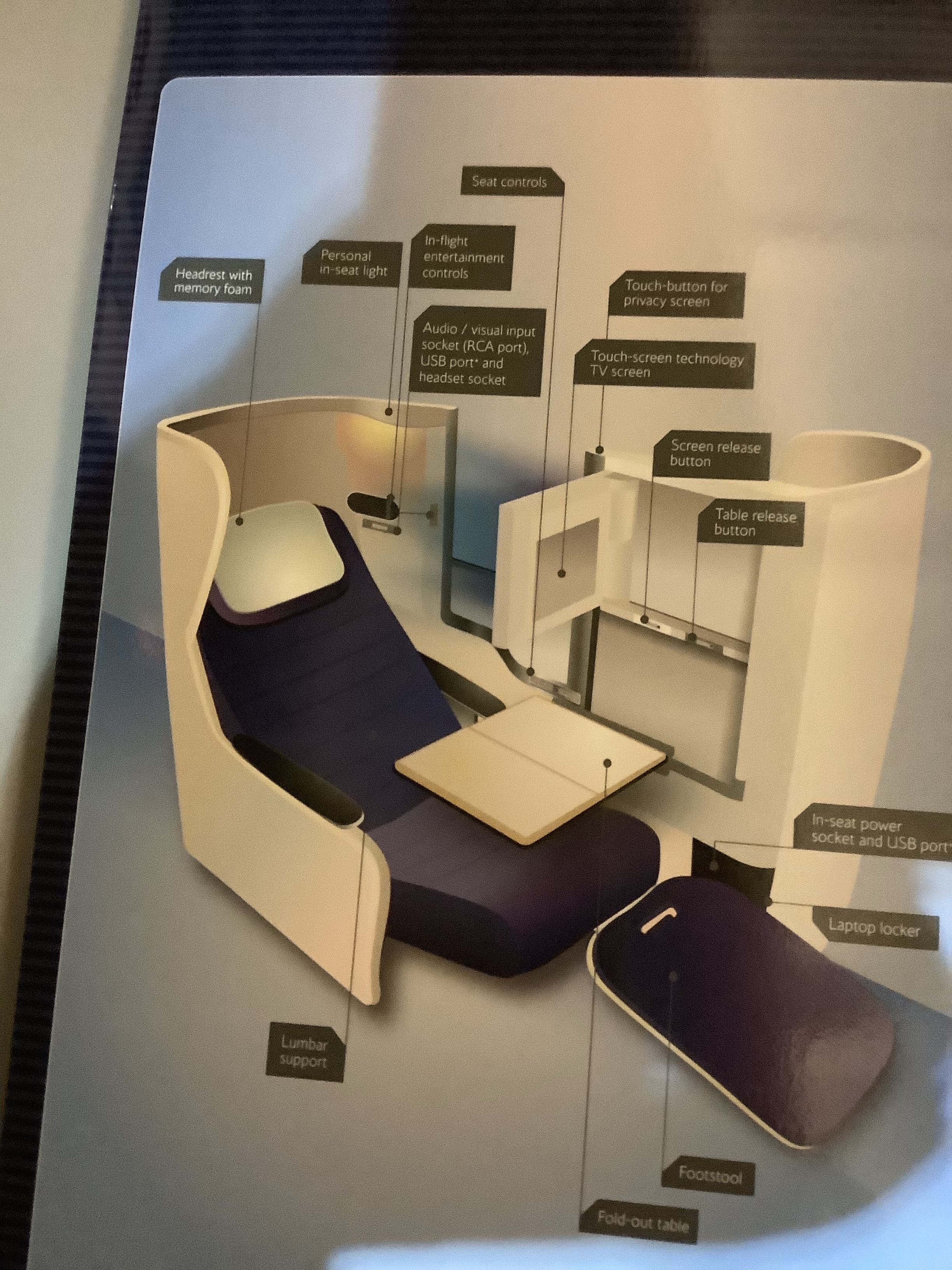 I took a walk around the plane. The nice attendant (who addressed me as “luv”) took me to see the new Premium Economy Section (like the premium section in Alaska), and then to the First Class cabin, with bigger, more luxurious and more spread out pods. He had me sit in one, and yes, it was pretty comfortable.