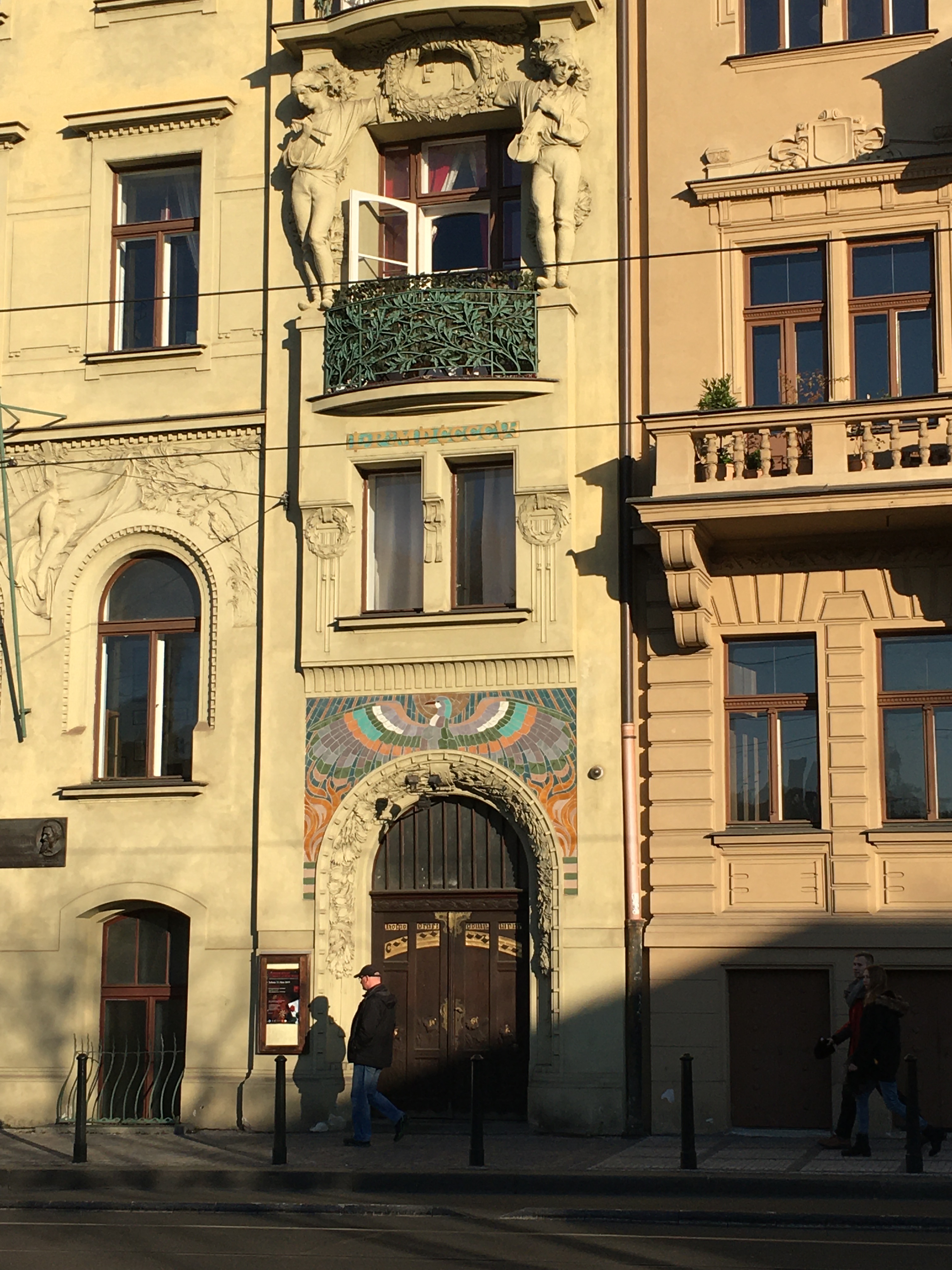 In the Old Town, and our neighborhood across the river too, each building is beautiful and different from the next. Here is on Art Nouveau building I studied; I loved the doorway detail, the iron balconies and the mosaics.