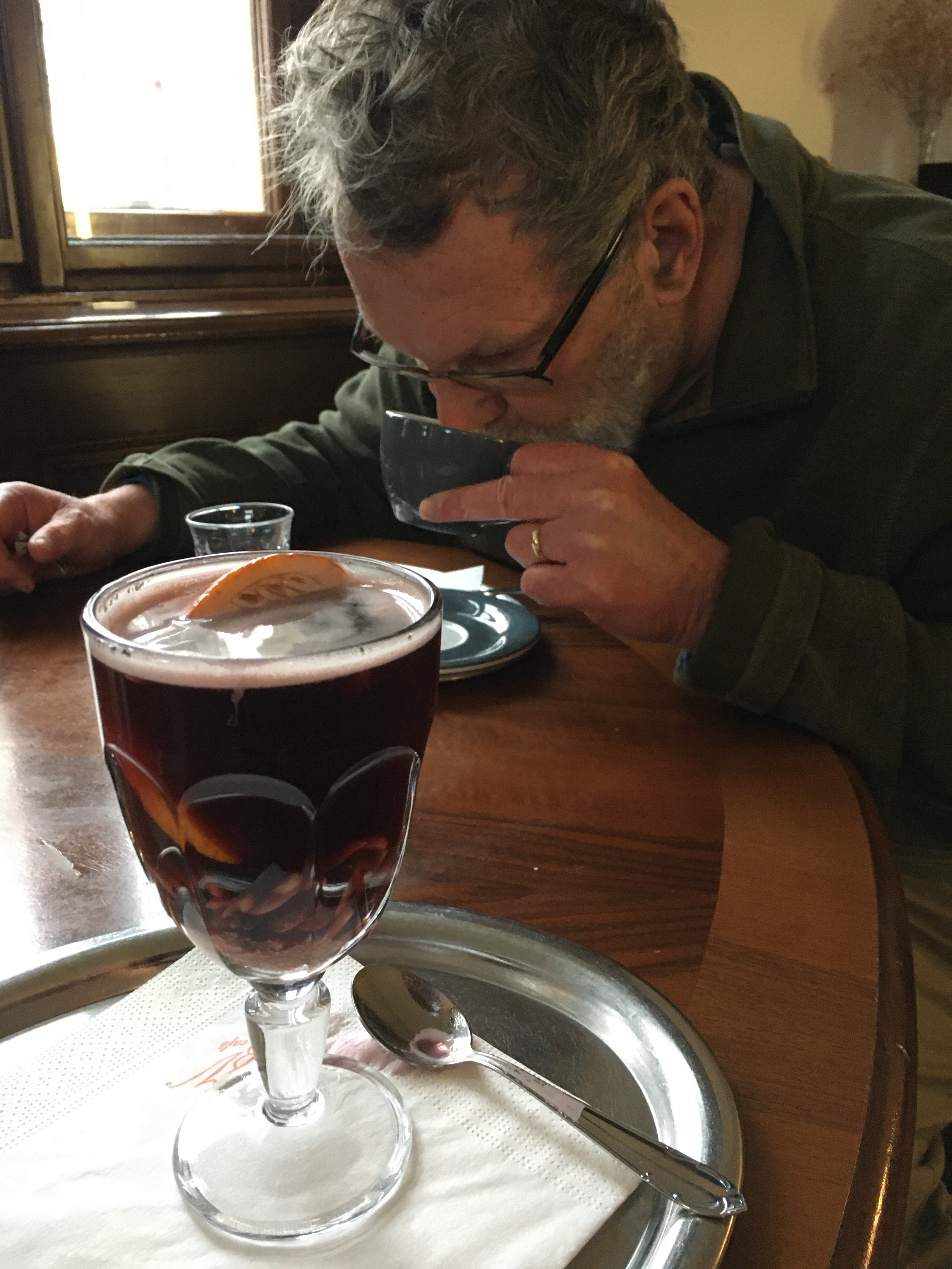 A couple hours and several miles later, we found ourselves across the bridge and on the home stretch. My knee started to hurt and I was dragging. Time for a coffee! And there on the left we saw a cafe sign for Bella Vida Cafe. We stepped through an unobtrusive door into another world. I felt transported to the 19th century. The low lighted room, trimmed in dark wood, had a variety of tables and old fashioned chintz covered chairs. A wood paneled bar took up one wall. We selected a table by the window. Soon the waiter, formally dressed in white shirt, tie and apron, brought over a little silver tray for each of us: a coffee for Mike in a china cup and saucer. For me, a glass of hot, spiced wine with almonds and raisins.