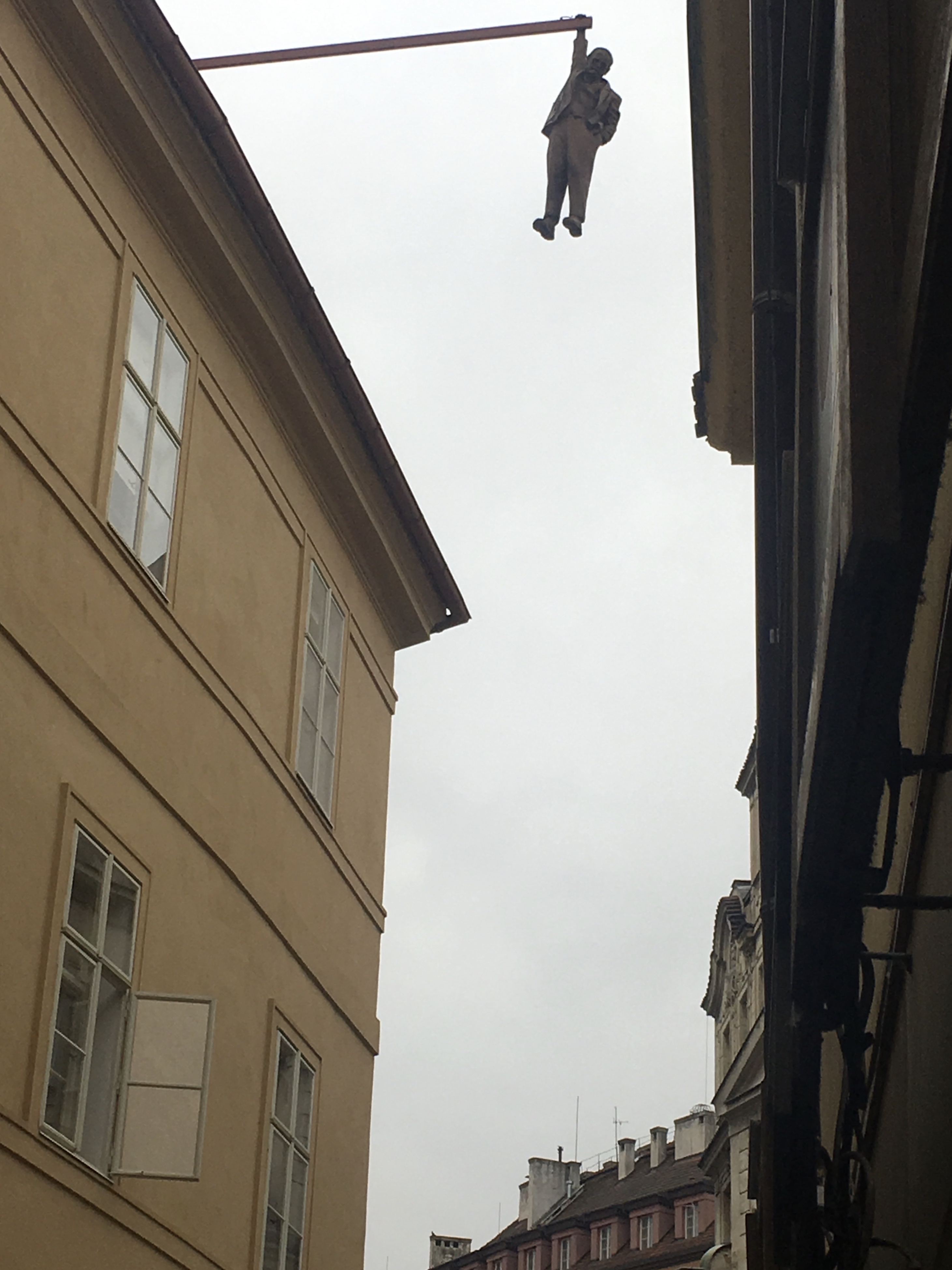 Near the river, we found the Kafka Museum, an in-depth focus on his life and his writing. I confess I’ve not read Kafka and I don’t think I ever will, but I get it now what kafkaesque means. Kafka spent his working life in an insurance company and hated how it interfered with his true vocation, writing. The exhibit was dark and basically depressing, but a sculpture in the courtyard lightened the tone.