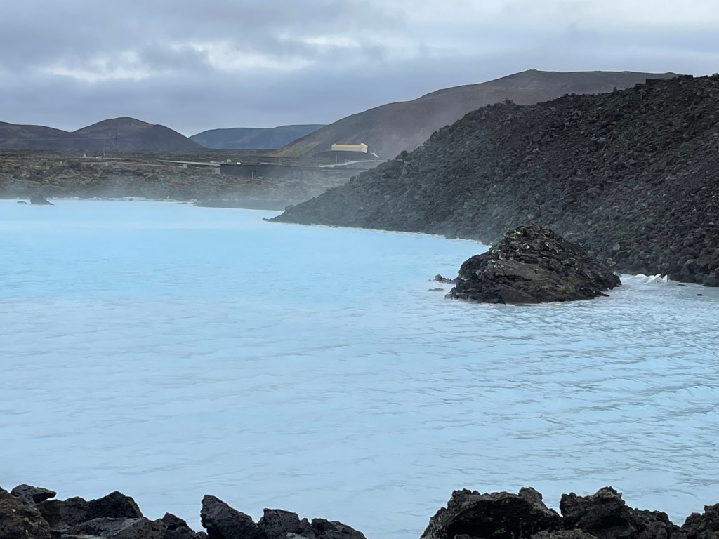 Our destination was The Blue Lagoon. Mary rented a car (a very nice Peugeot) and we drove the short 10 miles through dark and empty roads to our destination. By 8 am the parking lot was filling up, so we walked through the dark up a lighted path to a large modern building and checked in. Showered, and shedding our bathrobes, we inched down a sloped chute into the steamy water. The lagoon is huge! Once a natural sort of lake, it’s now cemented in, rimmed with large volcanic boulders. Silica made the footing a bit slick as we decided to walk around the pool. It was about 4 feet deep, some areas hotter than others, a milky aqua color. This took a couple of hours: we enjoyed the sunrise, various mud packs for our faces and a visit to the poolside bar for a cider.